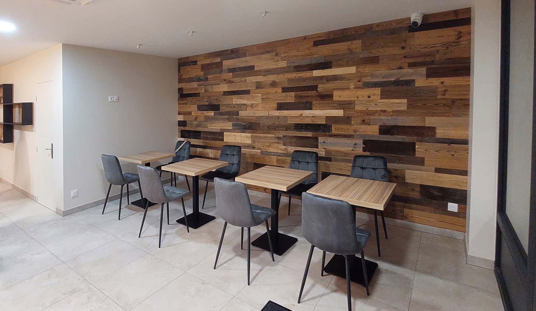 L’habillage en bois vieilli d’un pan de mur du salon de thé créé une atmosphère chaleureuse.