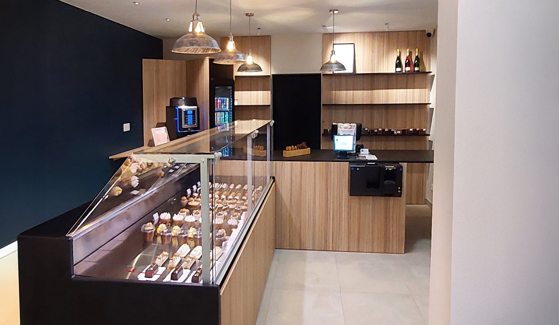Le mobilier, les étagères et la vitrine réfrigérée ont été posés sur mesure en 3 jours seulement.